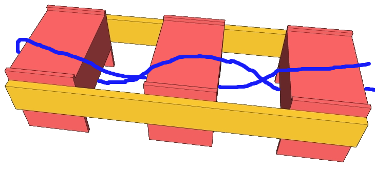 شکل سوم این فعالیت امکان اجرای بیشتری دارد و به فضا و وسایل خاصی که ممکن است در دسترس نباشد نیاز ندارد. با استفاده از کارتن یا مقوا چیزی که در تصویر قابل مشاهده است را می سازیم و کودک باید کاموا را از زیر و روی بخش هایی از آن که در تصویر به آن اشاره شده رد کند. قاعده ى کار مثل دو فعالیت قبلی است. یعنی هم می‌توان کاموا را ابتدا از زیر همه ی این بخش‌های مورد نظر و سپس از روی آنها رد کرد یا می‌توان این کار را به صورت یک در میان زیر و رو انجام داد.آموزش مفاهیم زیر و رو