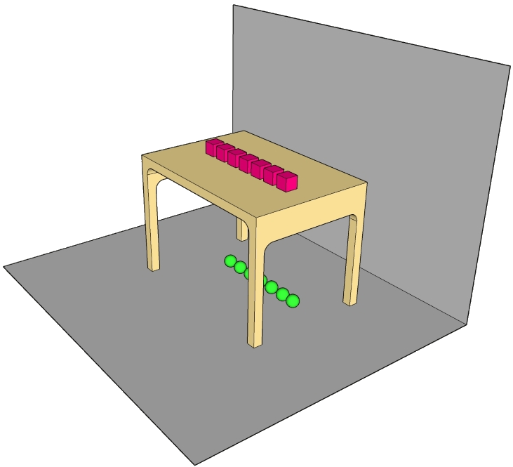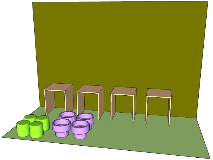در اینجا هم کار مانند فعالیت قبل است با این تفاوت که به جای یک میز، چند ساختار شبیه میز داریم و کودک باید اشیاء سبزرنگ را مثلاً رو و اشیاء بنفش رنگ را در زیر آنها قرار دارد