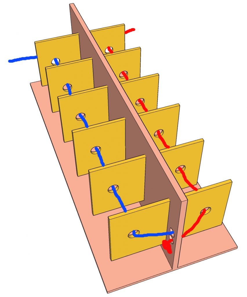 کودک باید دو رشته کاموا با رنگ‌های متفاوت را از سوراخهای روی بخش های عمودی این ساختار که در تصویر قابل مشاهده است عبور دهد