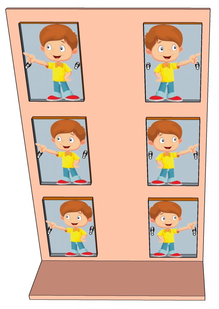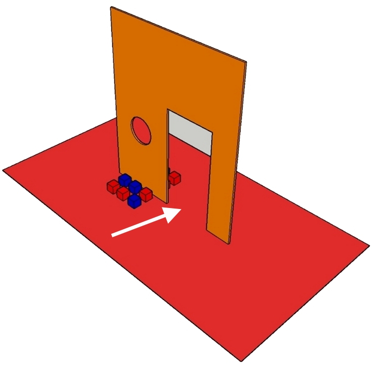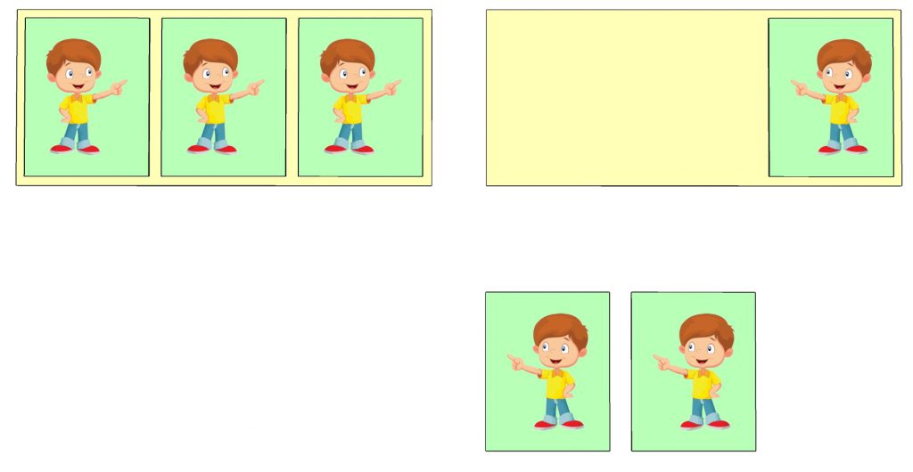 کودک در جایی که فلش اشاره می کند روی زمین می نشیند به شکلی که صورتش به طرف مکعب ها قرار می گیرد و کارتن فضای دیداری او را به دو قسمت چپ و راست تقسیم می کند