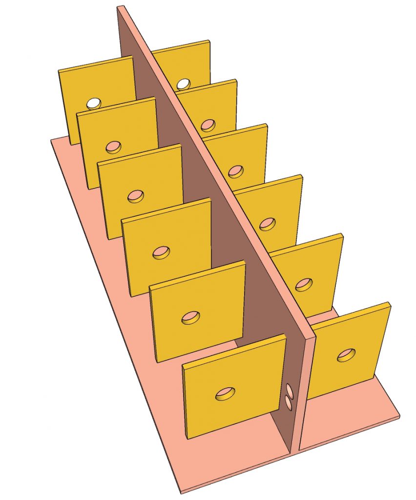 ساختاری مانند آنچه که در شکل می بینید می سازیم. کودک باید دو رشته کاموا با رنگ‌های متفاوت را از سوراخهای روی بخش های عمودی این ساختار که در تصویر قابل مشاهده است عبور دهد. به این ترتیب که اولاً هر کدام از کاموا ها باید صرفاً توسط دست یک سمت از سوراخ ها عبور داده شود و ثانیاً هر دو دست باید همزمان کار کنند. یعنی همزمان کامواها را بردارند و همزمان آنها را از سوراخ ها عبور دهند. در این فعالیت، این سازه‌ای که با کارتن ساخته شده باید به‌ گونه‌ای در مقابل کودک قرار گیرد که سوراخ ها در سمت چپ و راست کودک باشند و کودک از سوراخ های نزدیک تر به سمت سوراخ های دورتر یا برعکس یعنی از سوراخ‌های دورتر به سمت سوراخ‌های نزدیک‌تر کاموا ها را از آنها عبور دهد.آموزش مفاهیم چپ و راست