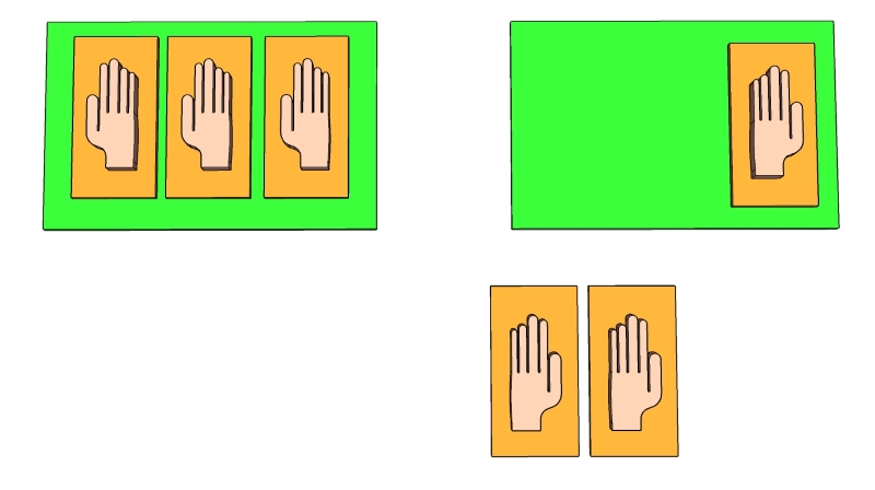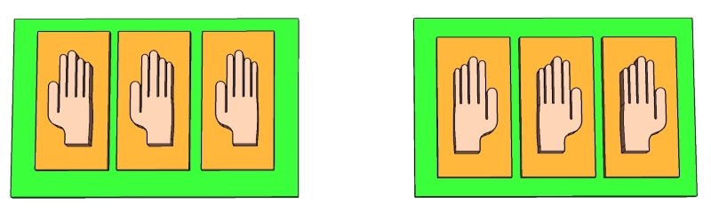 در این فعالیت مقوا هایی داریم که روی آن‌ها دست‌های ساخته شده از کارتن را چسبانده ایم. روی برخی از مقواها دست راست و روی برخی دیگر دست چپ چسبانده شده است. کودک باید مقواهایی که دست راست روی آنها چسبانده شده را در یک جا و مقواهایی که دسته چپ روی آنها چسبانده شده را در جای دیگر قرار دهد.آموزش مفاهیم چپ و راست